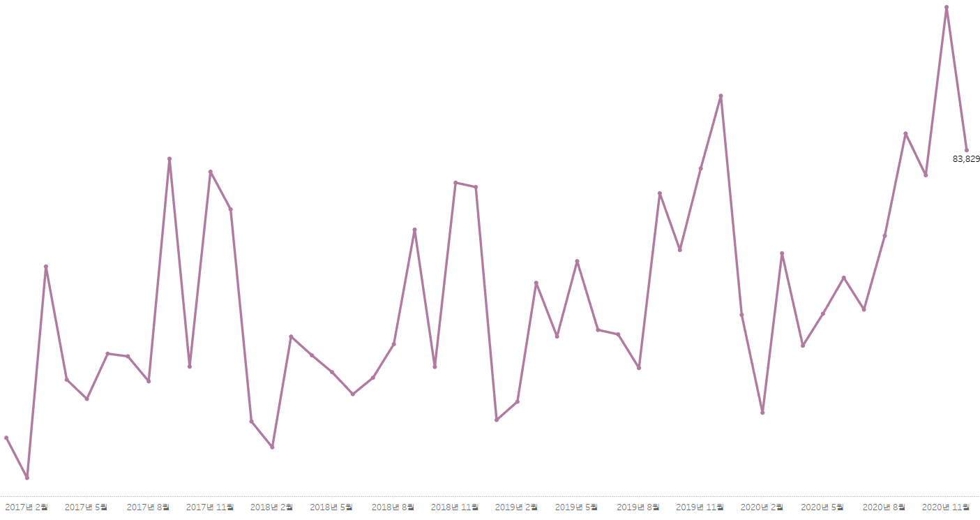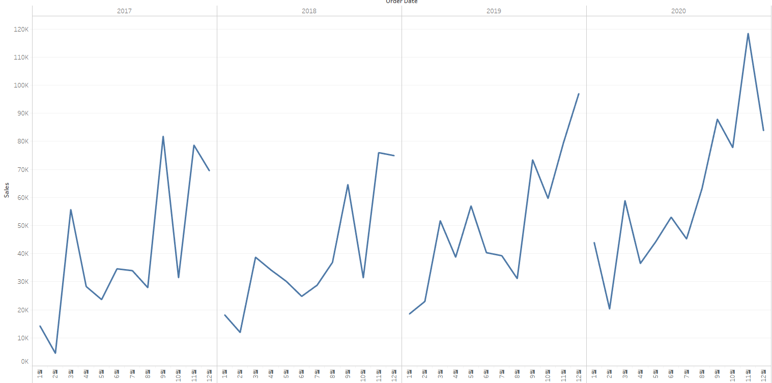 특별히 월별 Sales 합계 라인 차트를 보면, 년도가 넘어갈 때마다 라인이 끊겨 있는 있는 것을 확인할 수 있습니다.