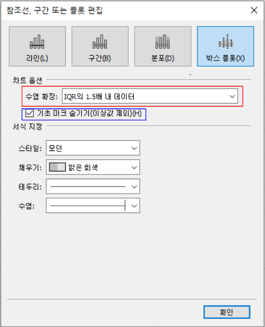 박스 플롯에 표시하는 수염 위치를 아래 절차로 확인할 수 있습니다.