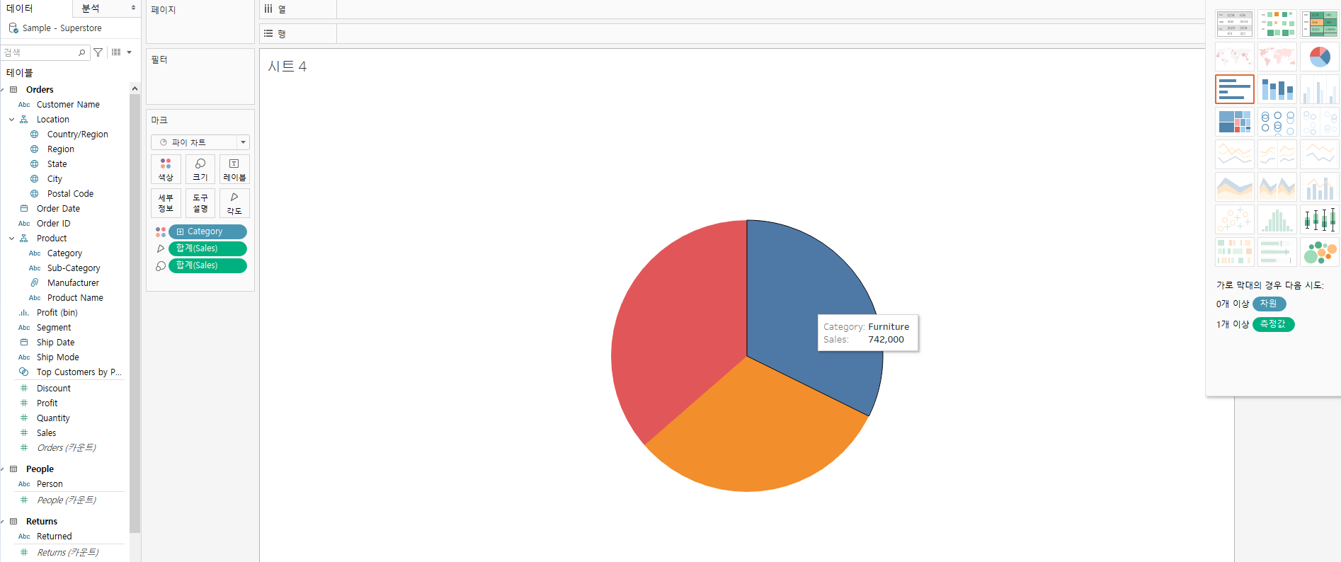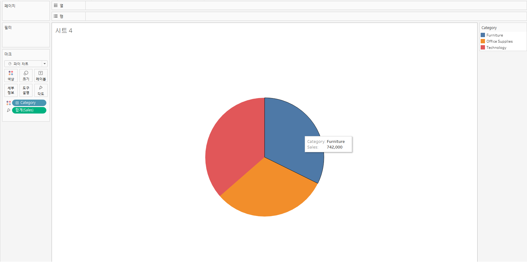 전체 데이터의 Category 필드 범주 데이터 별 Sales 합계를 파이 차트로 시각화합니다.