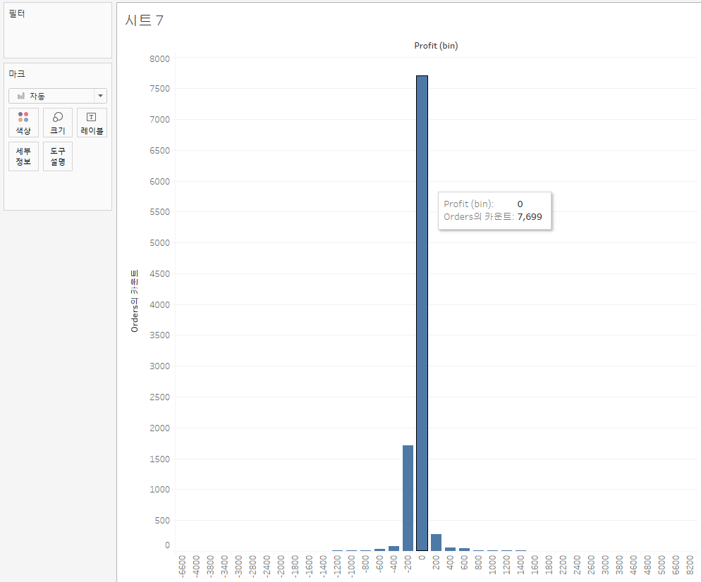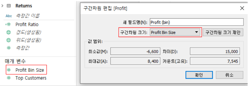 - Profit (bin) 필드 우클릭 -> 편집 -> 구간차원 크기-> 값 입력 -> 500