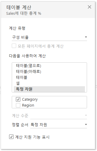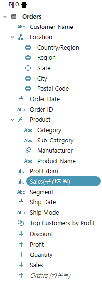 - Sales(구간차원) 필드가 새로 생성됩니다.