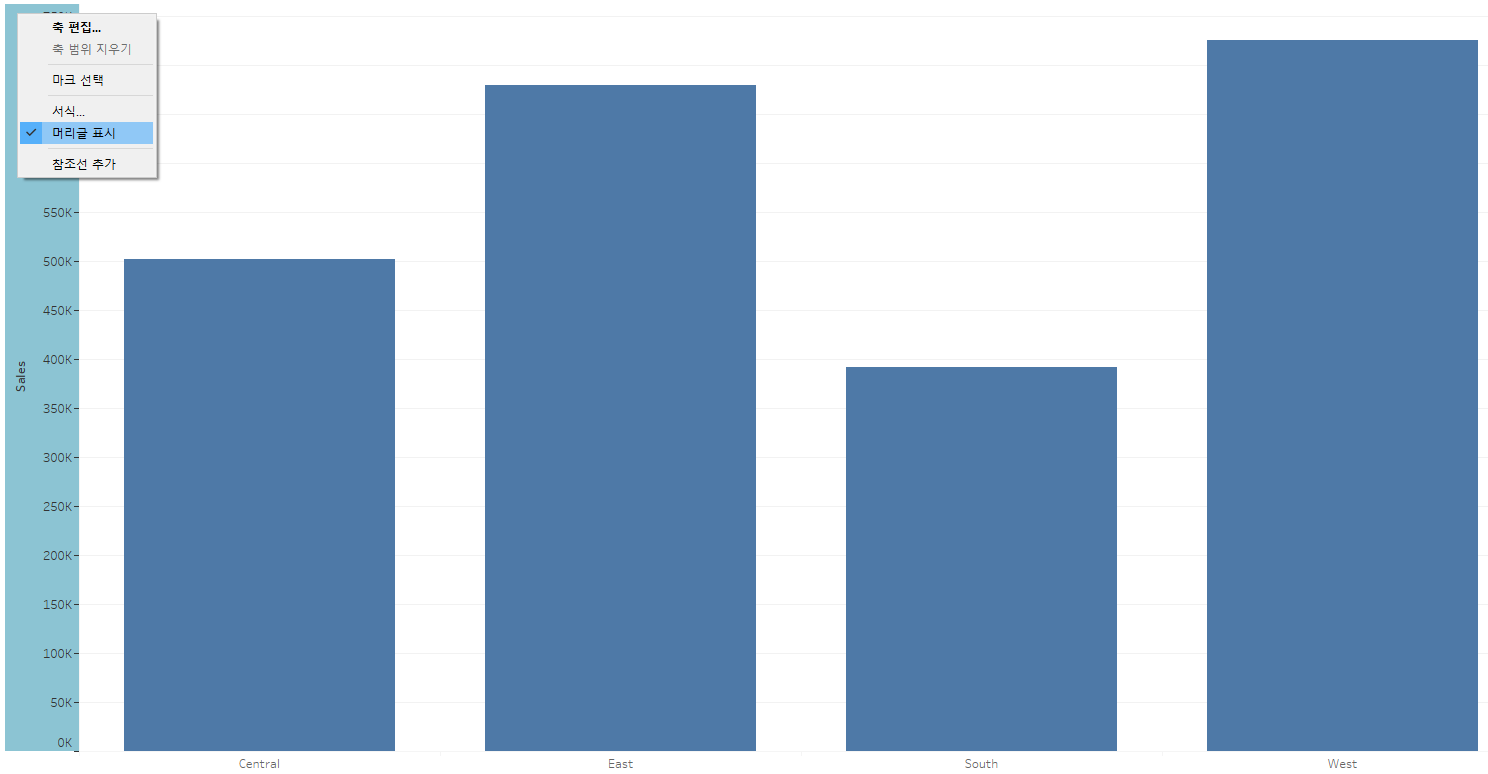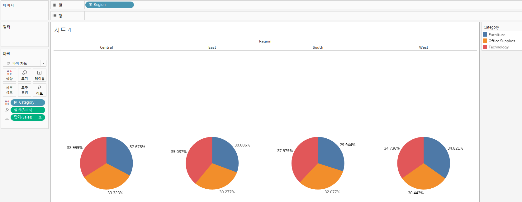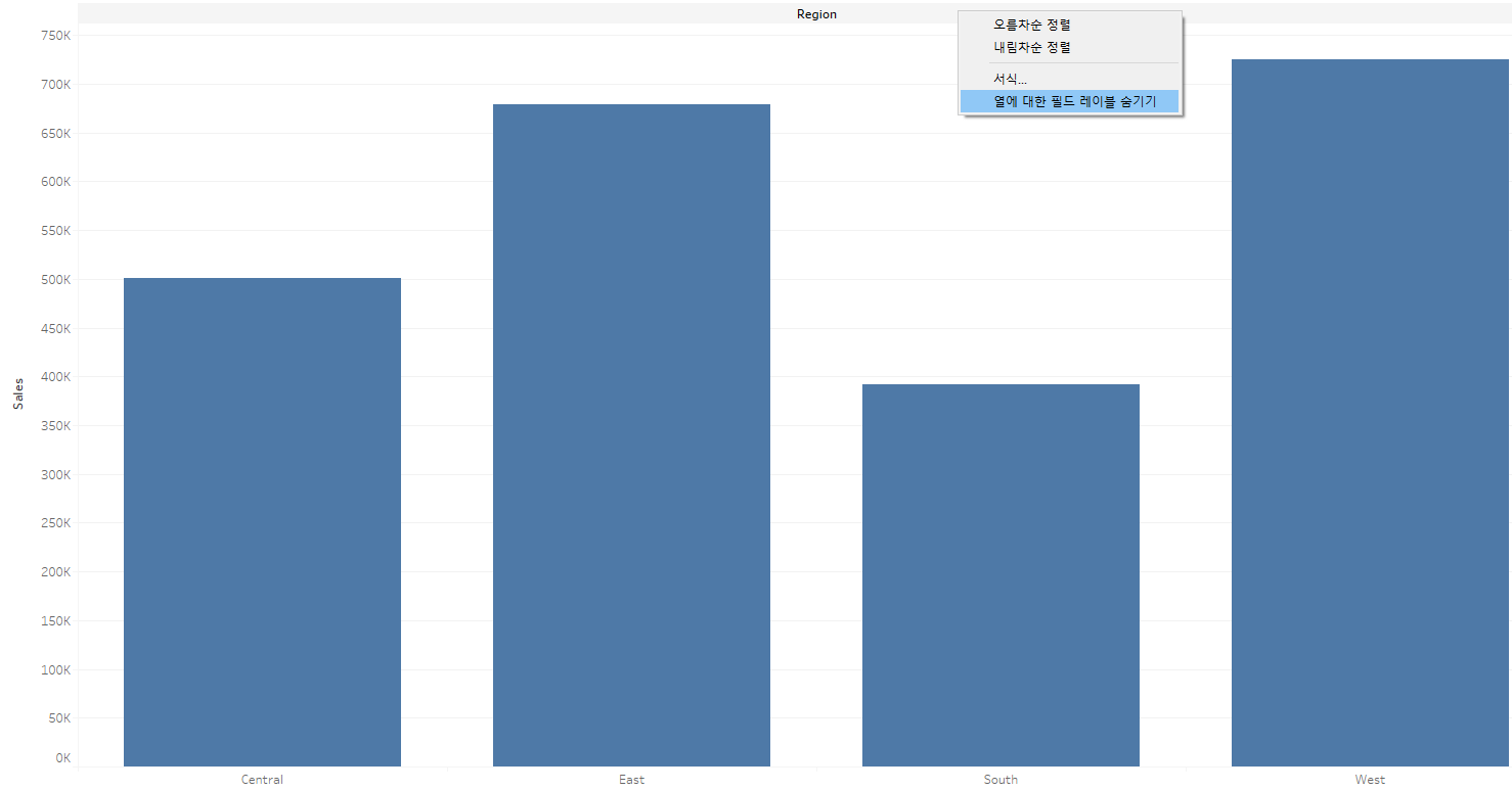 - Region 필드의 Central, East, South, West 데이터만 표현해도 해당 필드가 Region임을 추측할 수 있기 때문에 차트 상단 Region 레이블을 숨깁니다.