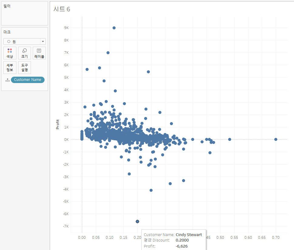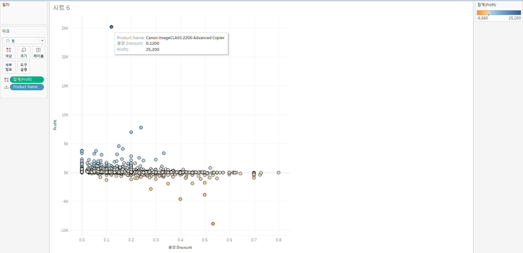 - 트리맵과 마찬가지로, 화면 우측 하단에 3음수(Profit 필드에 표시되지 않는 3개의 음수 값이 있습니다) 발생 -> 위 문제를 해결하기 위해 마크 카드 크기에 Sales 필드를 올리고, 마크 카드 색상에 Profit 필드를 올립니다.