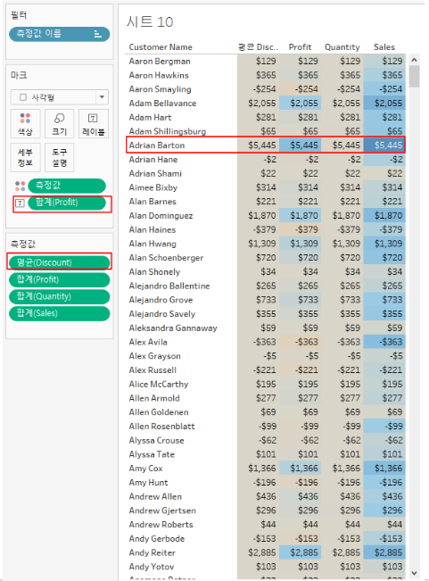 - 각 측정값(Discount, Profit, Quantity, Sales)에 따른 값이 올바로 표현됩니다.