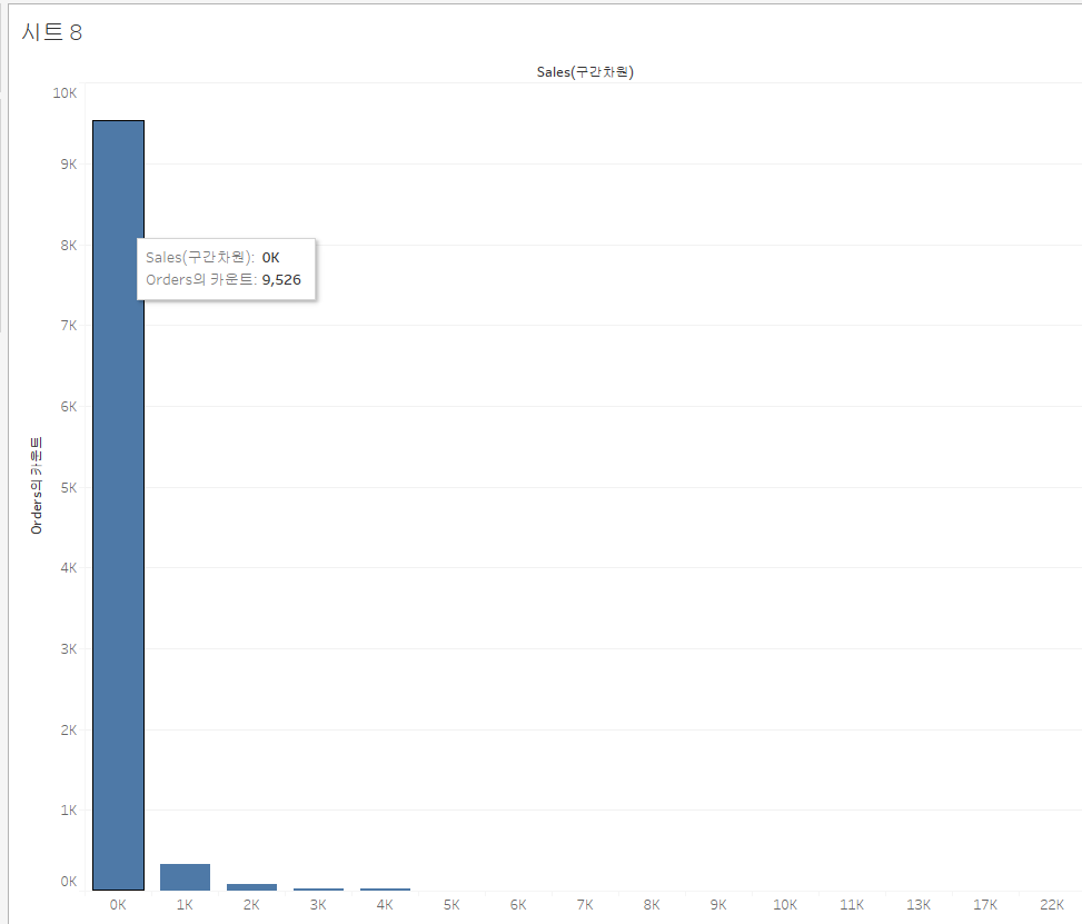 이제 생성한 Sales(구간차원) 필드와 Orders(카운트) 필드를 선반에 올려서 히스토그램을 시각화합니다.