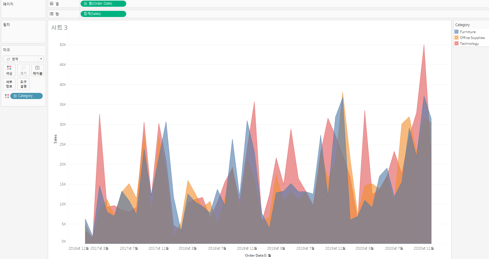 - Technology, Office Supplies, Furniture 순으로 데이터를 쌓아서 영역 차트를 시각화합니다. -> 쌓았기 때문에 전체 Category 항목의 전반적인 트렌드를 확인할 수 있습니다!
