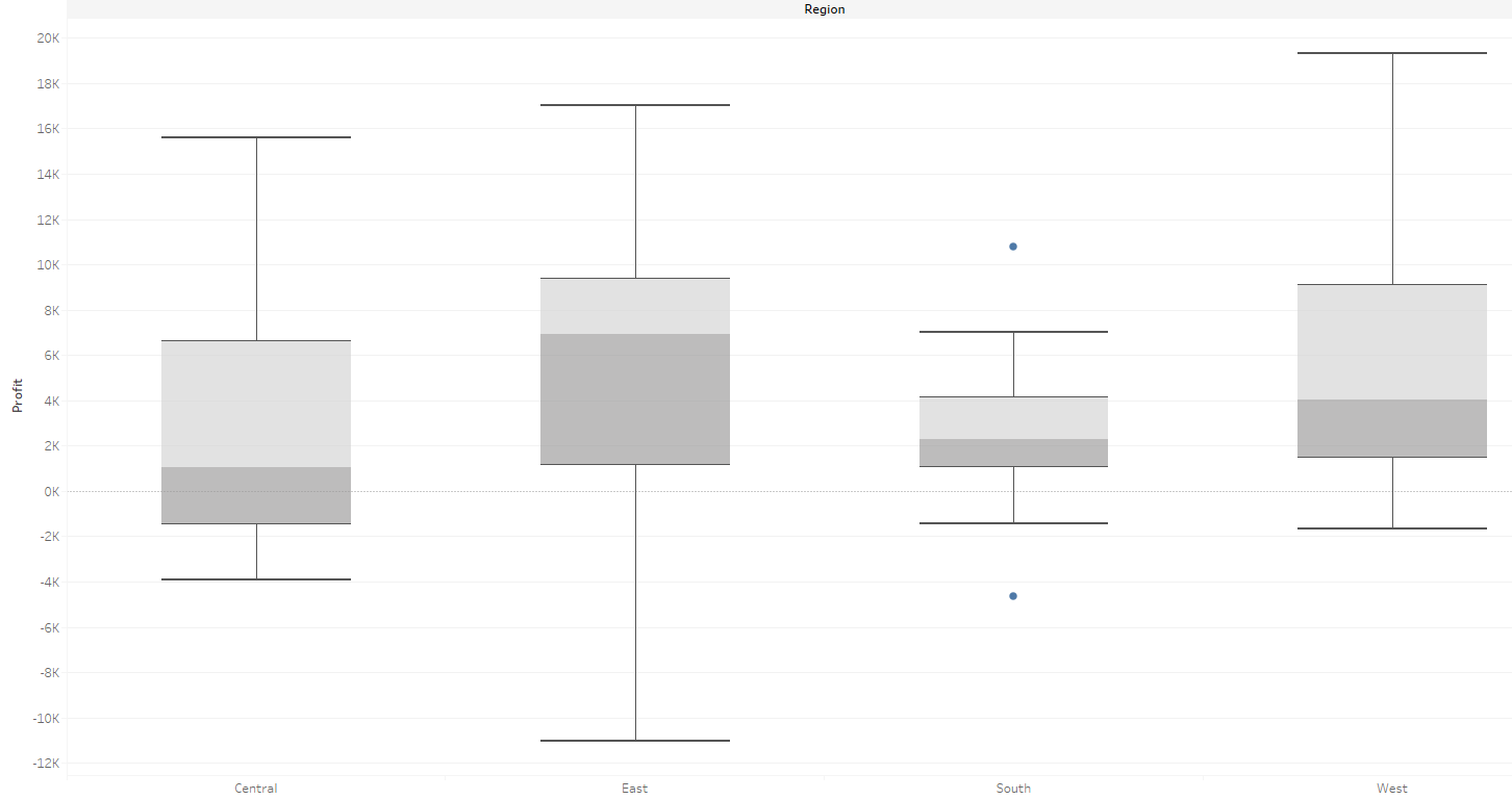 2) Region 필드 각 범주 데이터로 분기한 Sub-Category 필드 각 범주 데이터 별 Profit 합계 박스 플롯