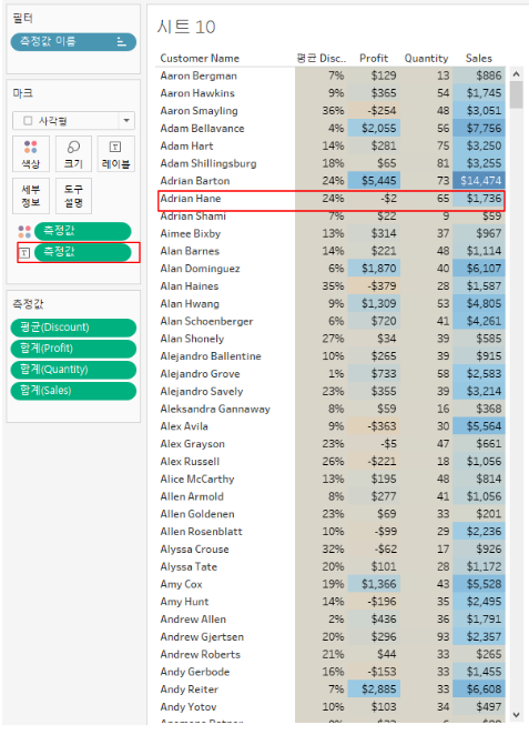 위 테이블의 각 측정값(Discount, Profit, Quantity, Sales)마다 다른 색상을 지정합니다.