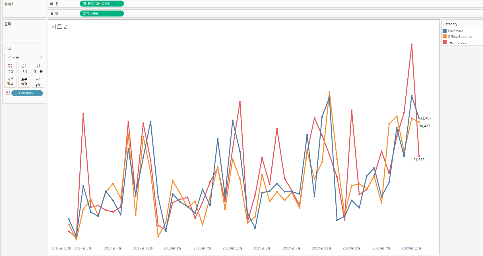 - Category 범주 데이터 Furniture, Office Supplies, Technology를 각각 라인 차트로 시각화합니다.