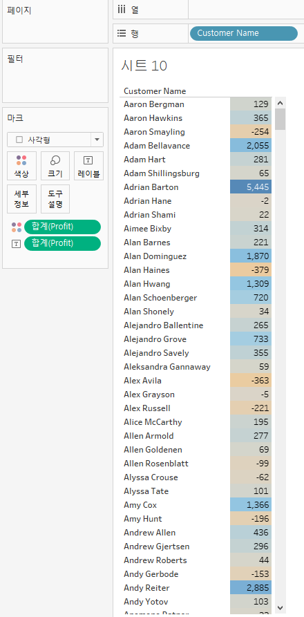 - 마크 카드 색상에 올라간 측정값 클릭 -> ctrl을 누른 채로 마크카드 레이블에 올라간 합계(Profit)에 드래그 앤 드랍 -> 마크 카드의 레이블이 차트 또는 테이블에 출력되는 값을 결정한다는 사실 기억!