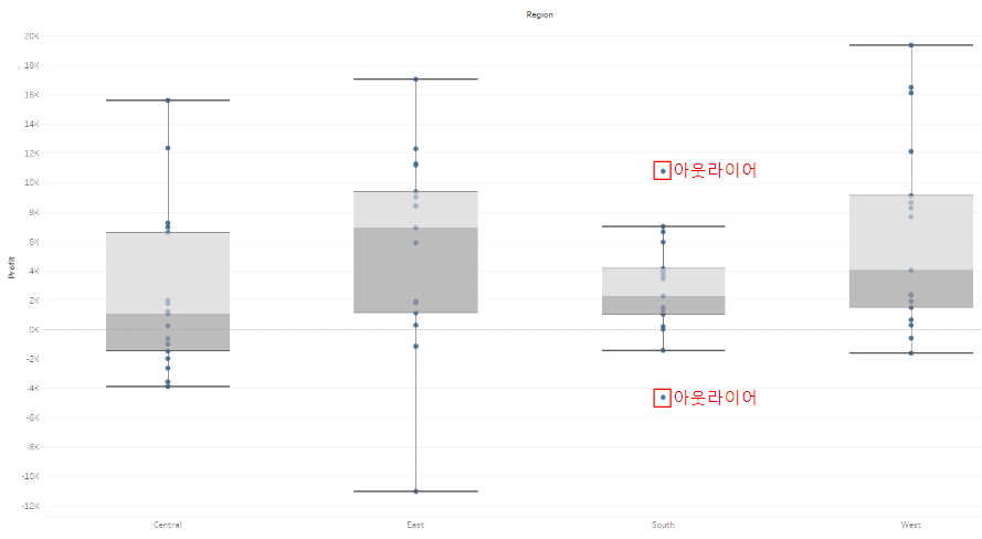 - 아웃라이어 데이터만 확인하고 싶은 경우에는 기초 마크 숨기기(이상 값 제외)를 체크합니다.