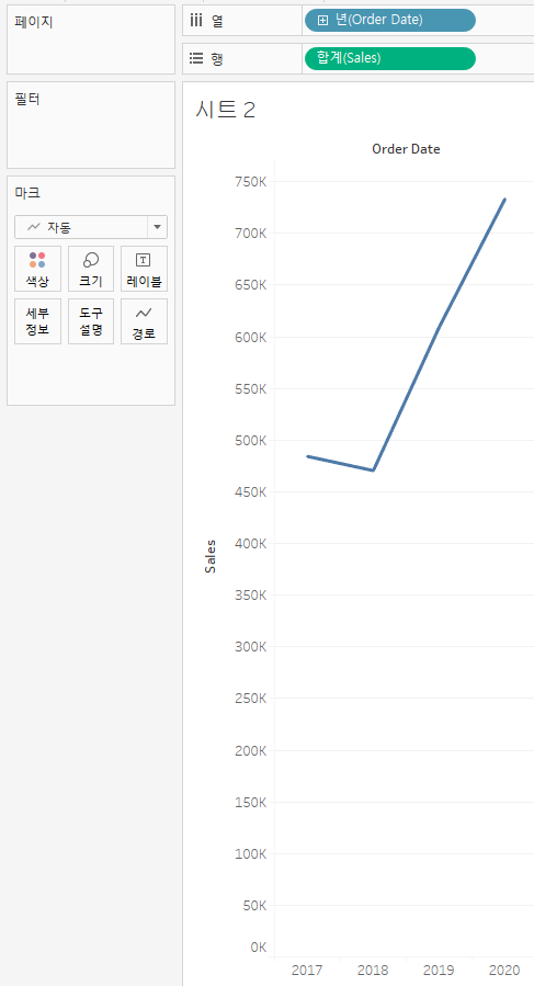 바 차트와 마찬가지로, 마크 카드를 확인해보면, 라인 차트 기호와 함께 '자동'으로 표기되어 있습니다. 이는 Tableau가 Order Date 필드와 Sales 필드를 시각화할 때, 라인 차트가 가장 적절하다고 판단하는 것입니다.