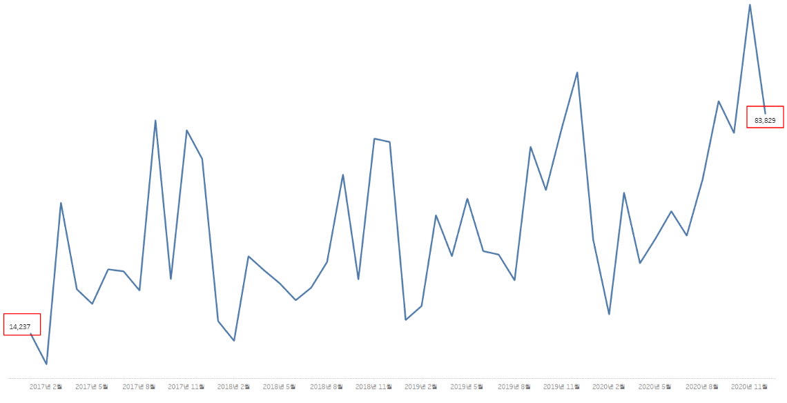 - 매월 모든 데이터 레이블 표시되므로, 화면이 다소 복잡할 수 있습니다.