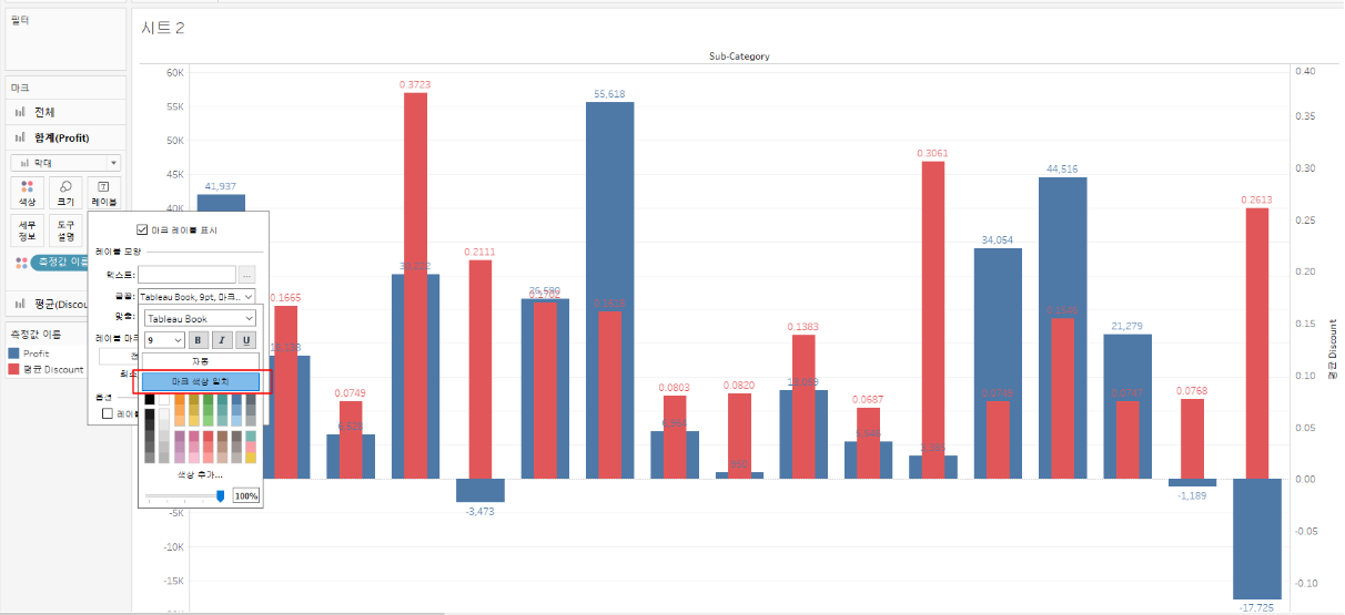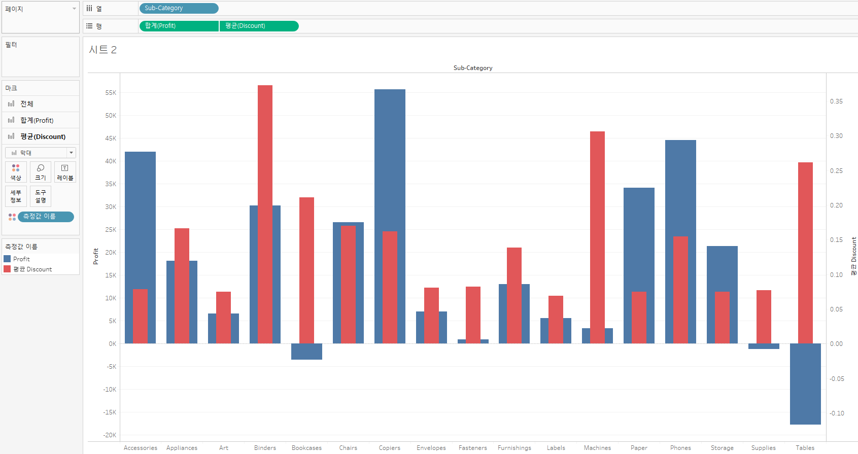 - Profit, Discount 측정값 필드를 행 선반에 올립니다.