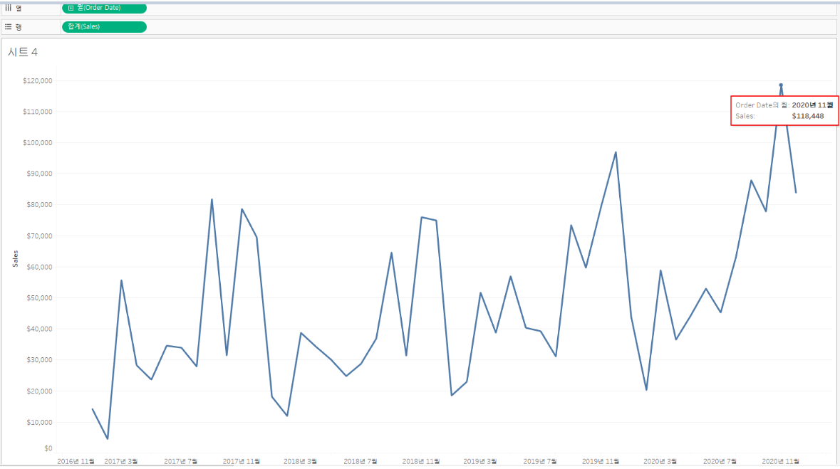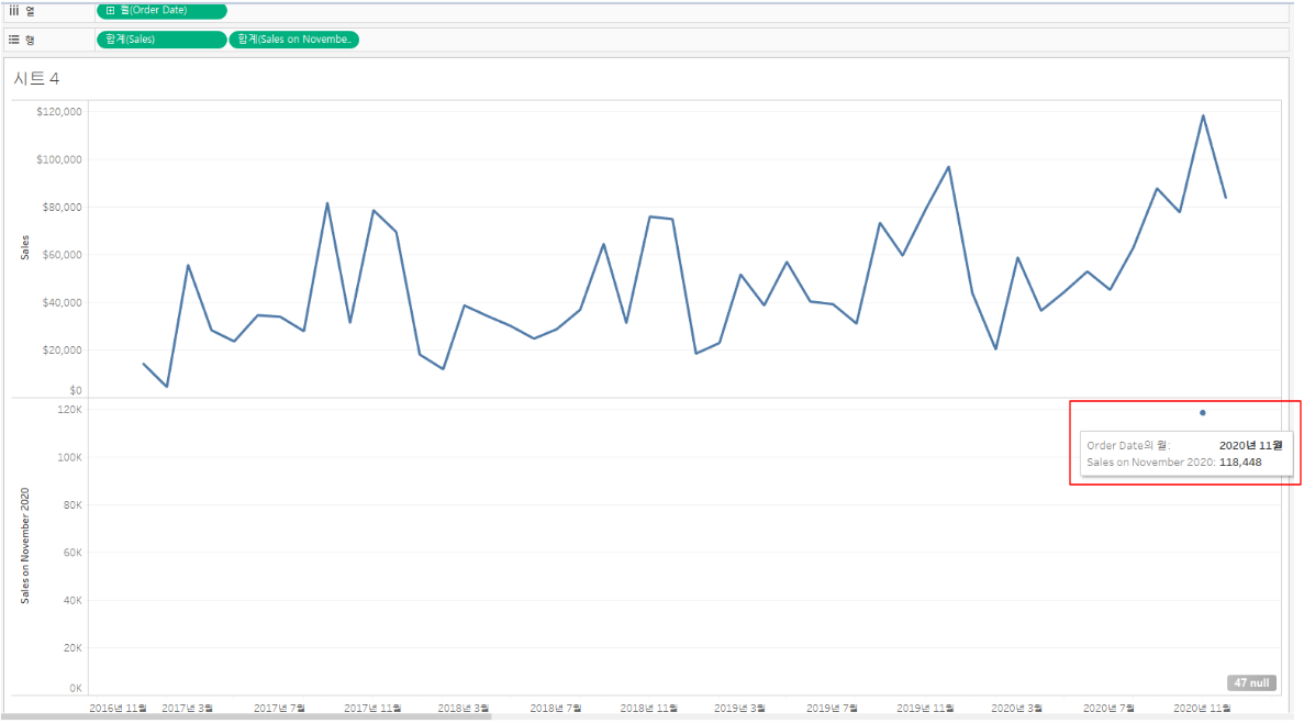 위 라인 차트에서 2020년 11월의 Sales 합계($118,448)를 강조하기 위해서는 2020년 11월에 발생한 Sales 금액을 가져오는 새로운 측정값 필드를 생성하고, 이를 이중축(Dual Axis)의 두 번째 측정값으로 간주합니다.