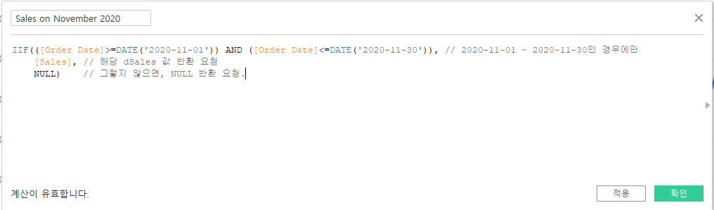 - 전체 Order Date 필드에서 '2020-11-01' 이상, '2020-11-30' 이하인 경우에만 Sales 값을 반환하고, 나머지 날짜는 NULL을 반환합니다.