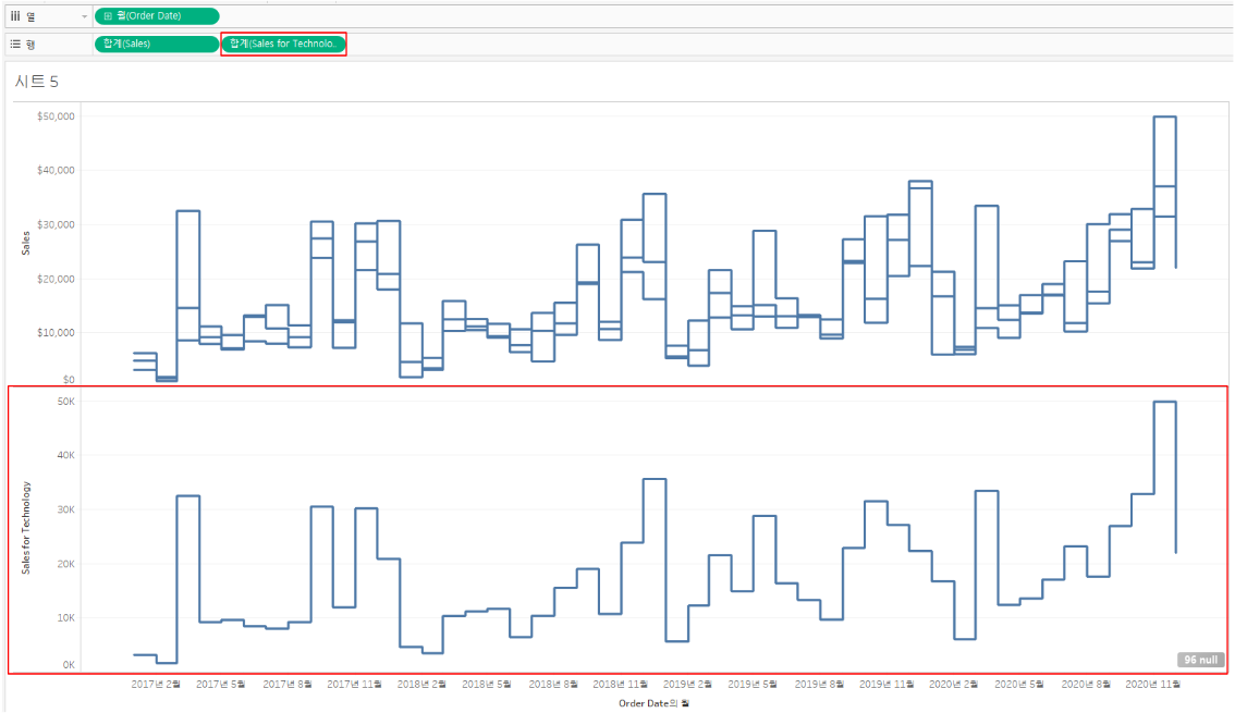 - 행 선반에 올라간 Sales for Technology 필드 우클릭 -> 이중 축 -> 축 동기화
