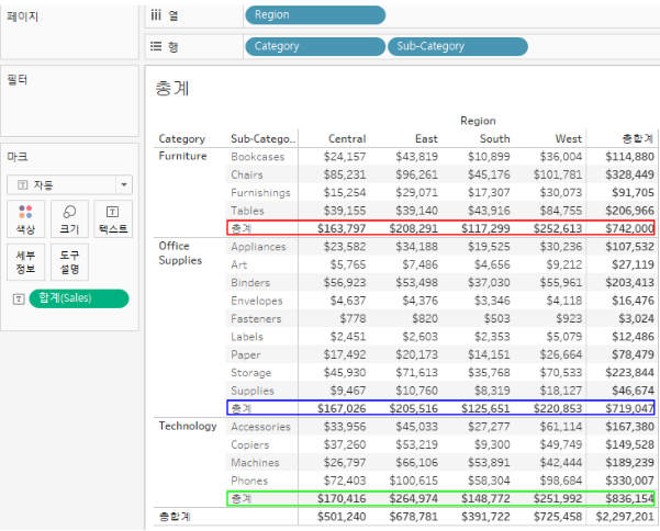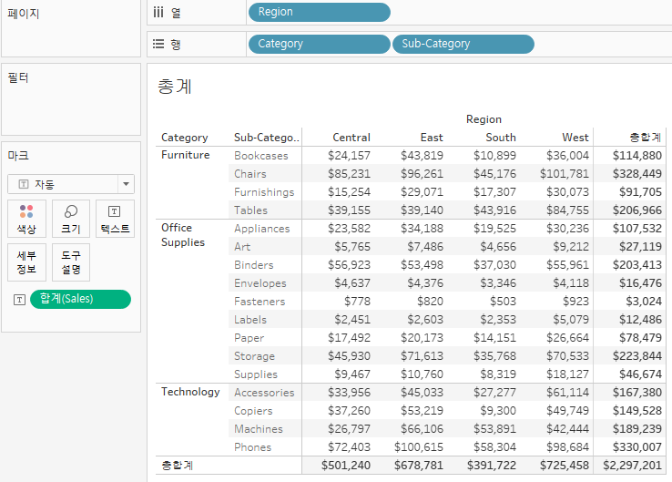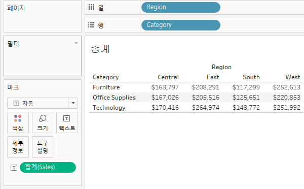 분석 패널의 총계는 테이블의 각 행이나 열 데이터의 합산을 수행합니다. 총계를 테스트하기 위해 각 Category 항목 및 Region 항목 별 Sales 합계 테이블을 생성합니다.