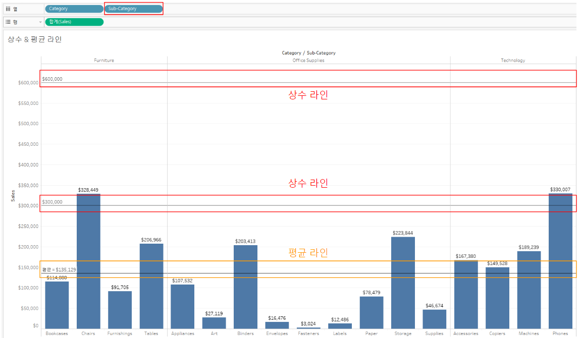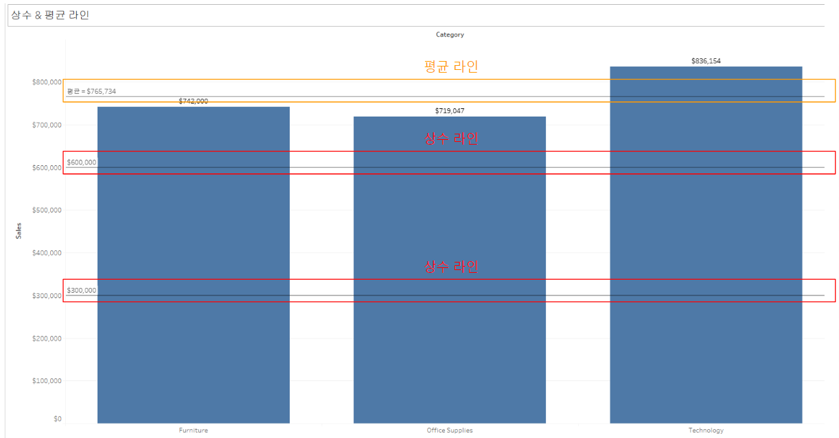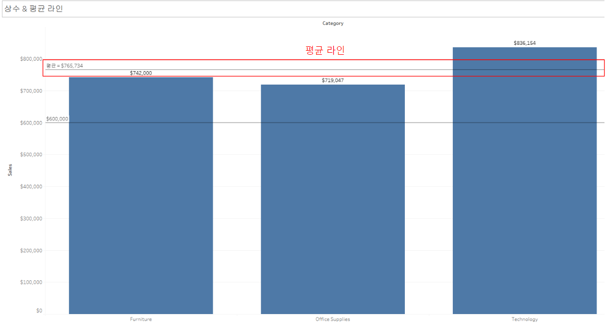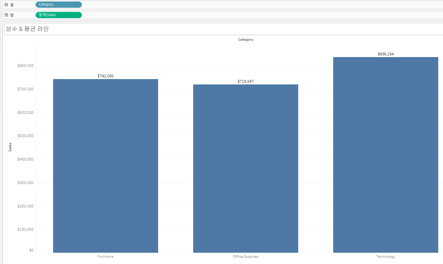분석 패널의 상수 라인과 평균 라인을 테스트하기 위해 Sample - Superstore 데이터셋 Orders 테이블의 각 Category 항목의 Sales 합계를 시각화합니다.