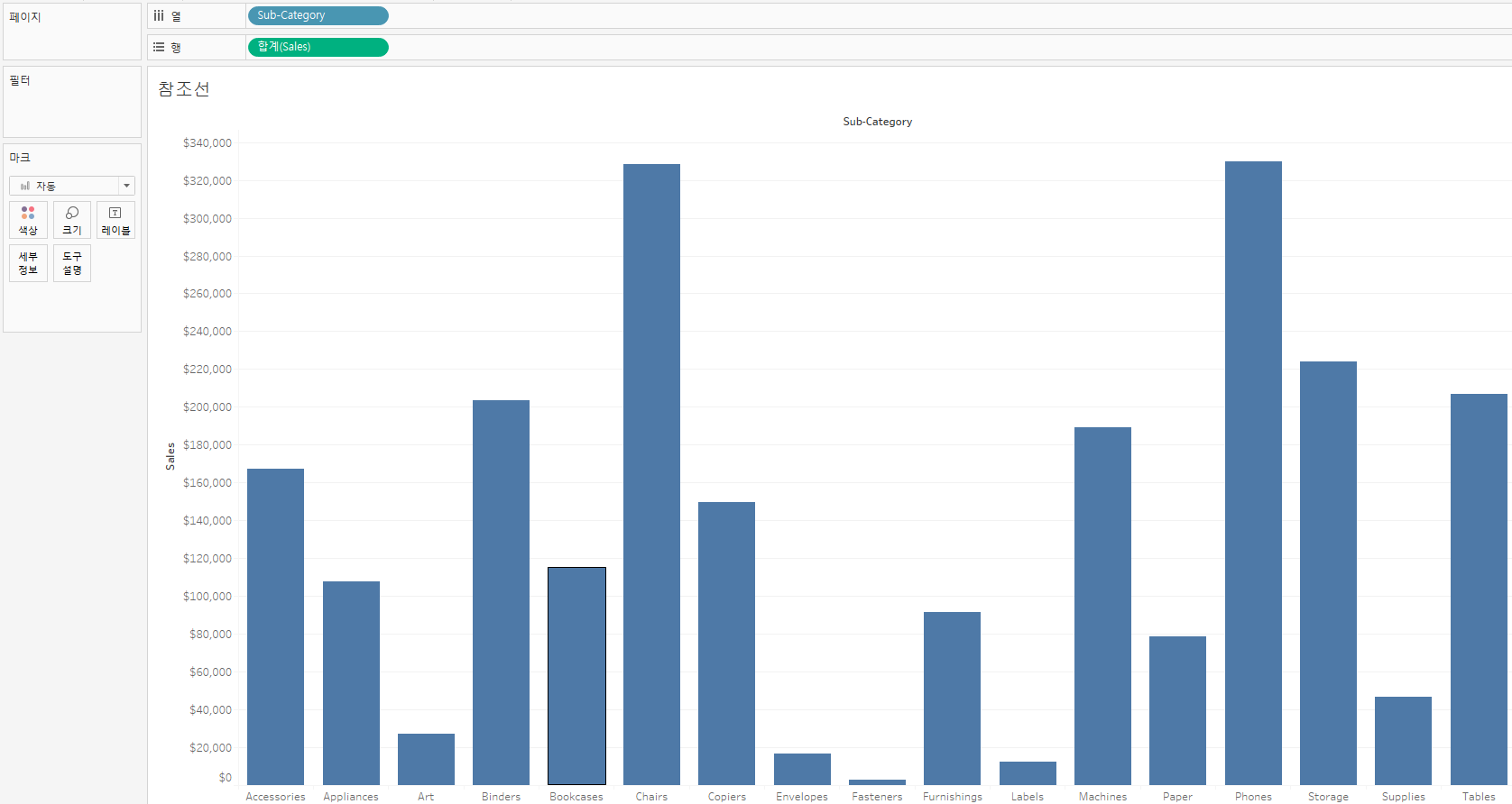 분석 패널의 참조선은 차트에 특정값에 해당하는 라인을 표기하여 값을 식별할 수 있도록 하는 기능입니다. 참조선을 테스트하기 위해 각 Sub-Category 항목 별 Sales 합계를 시각화합니다.