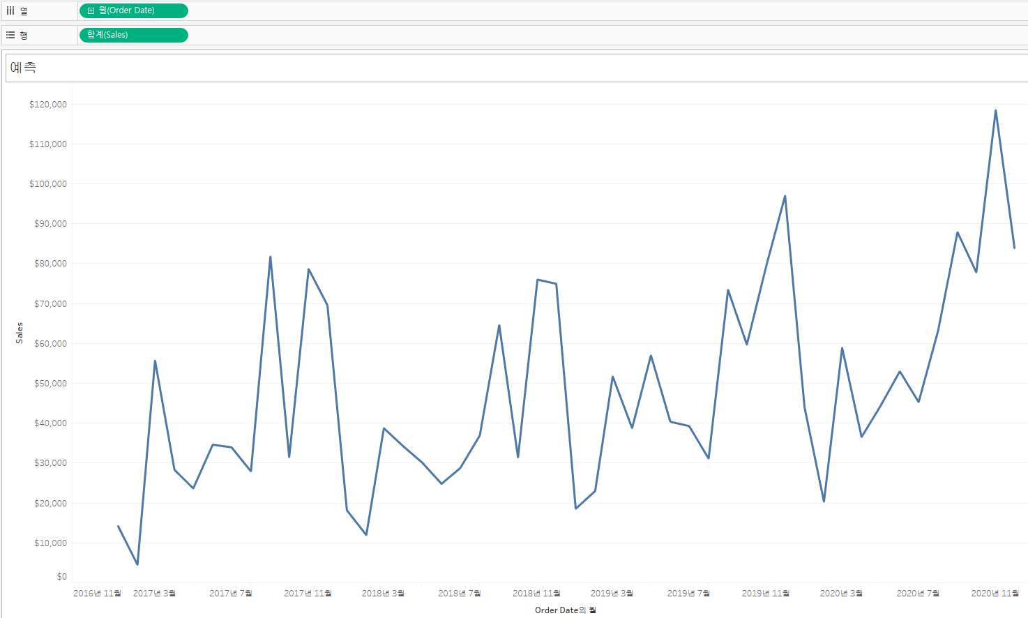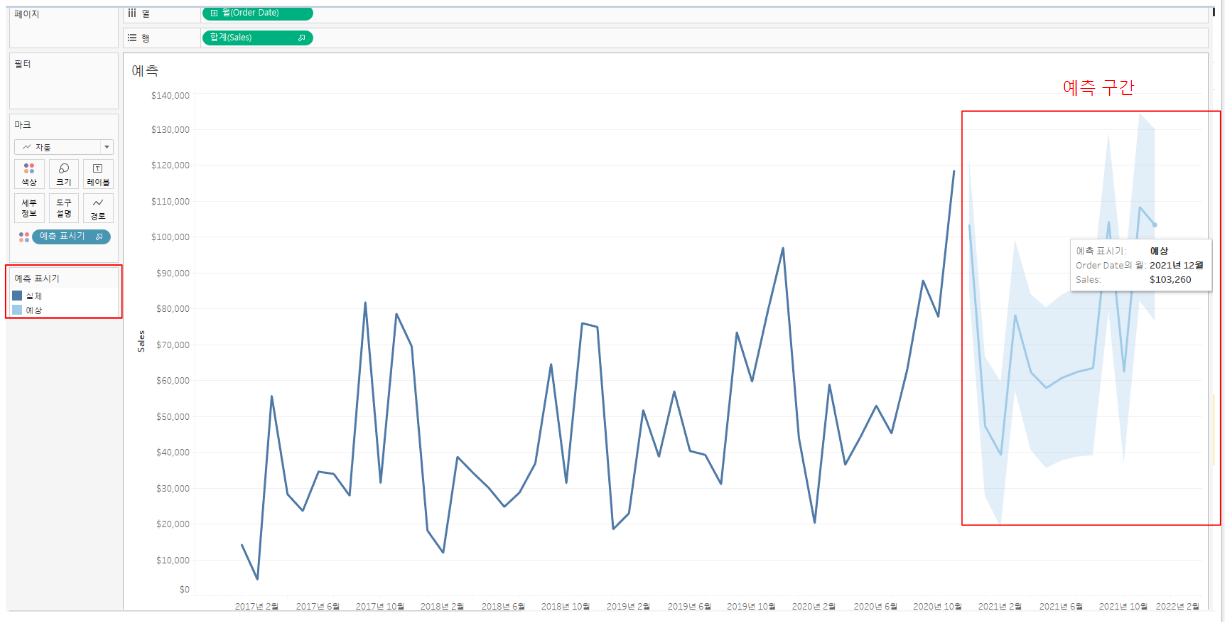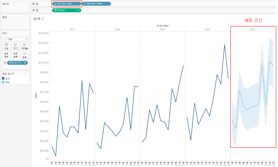 또한, 불연속형 날짜 필드에 대해서도 예측을 수행할 수 있습니다. 이때, 시간의 흐름을 알려주기 위해 열 선반에는 년(Order Date)을 추가로 올려줘야 합니다.