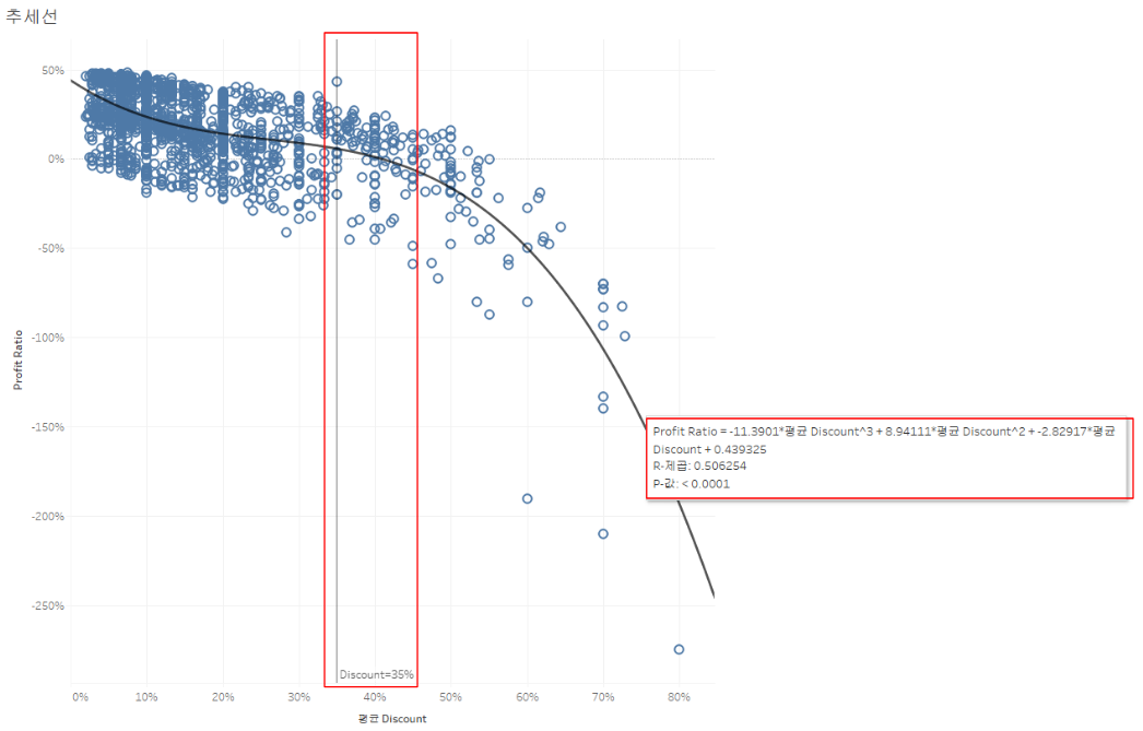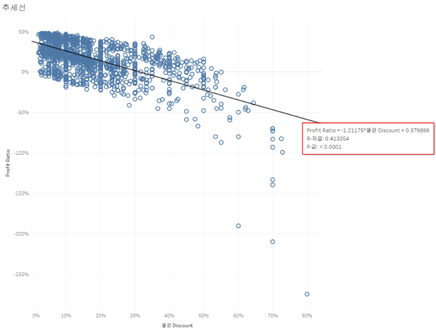 - Profit Ratio = -1.21175 * 평균 Discount + 0.379896