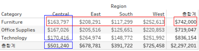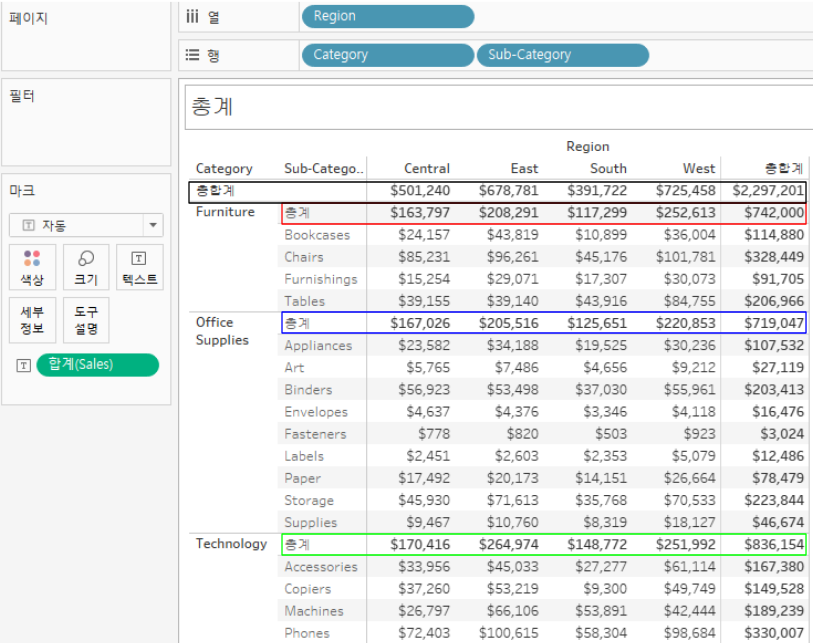 - 각 Category 항목, Sub-Category 항목, Region 항목 별 Sales 합계와 각 행과 열의 총계를 확인할 수 있습니다.