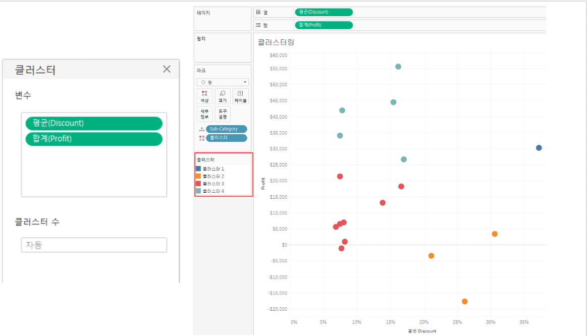 - 변수 Discount, Profit로 표현된 Sub-Category를 분류할 클러스터 개수를 설정합니다. (기본적으로 4개 클러스터를 사용합니다.)