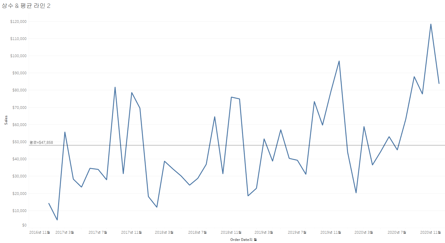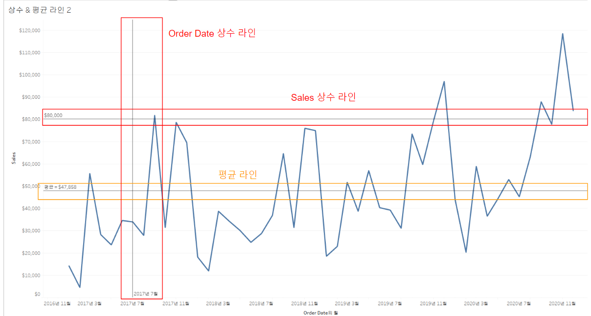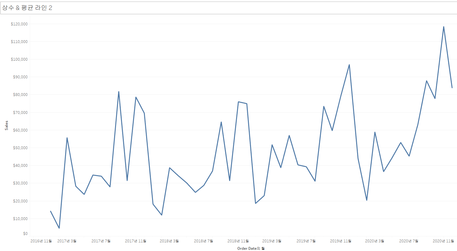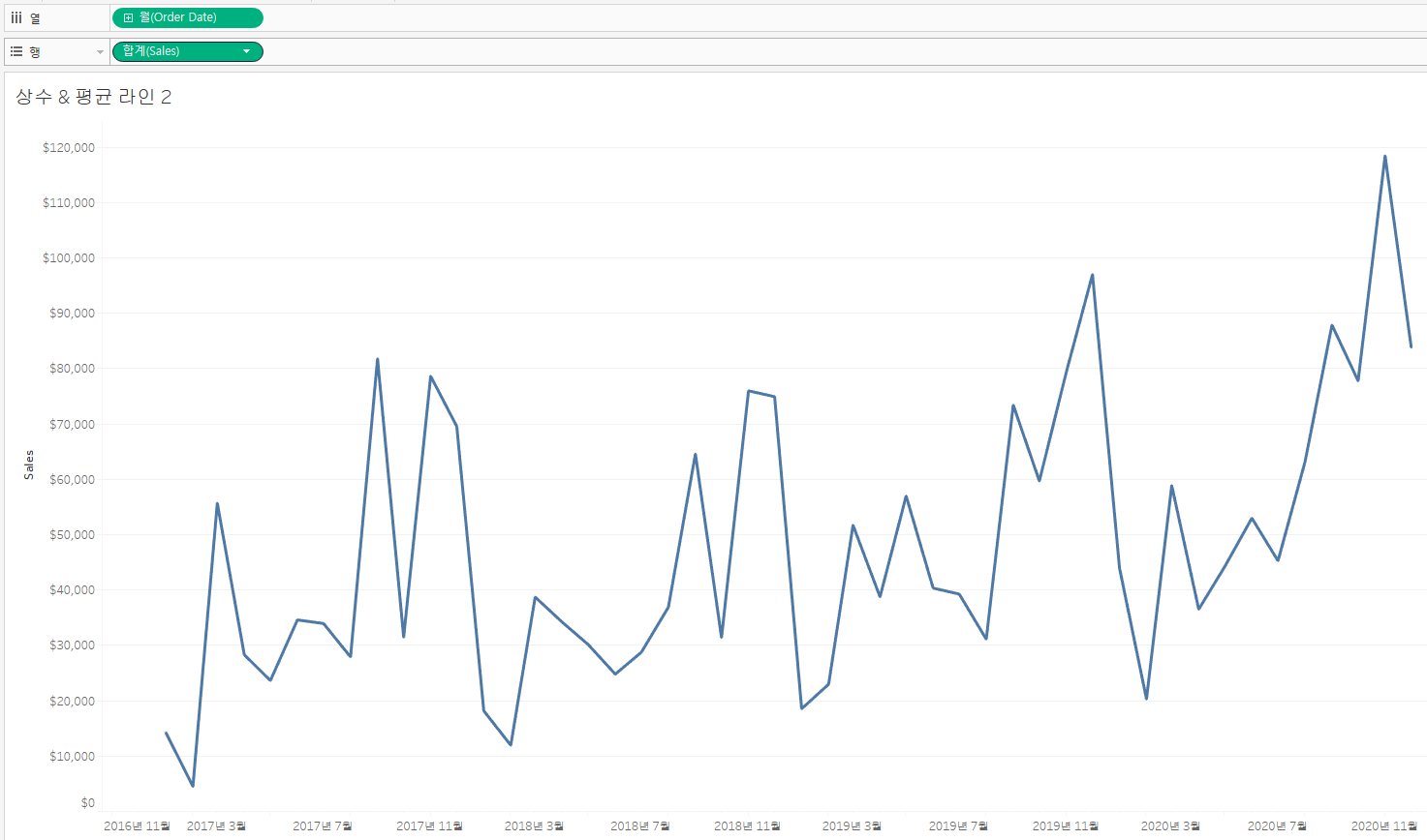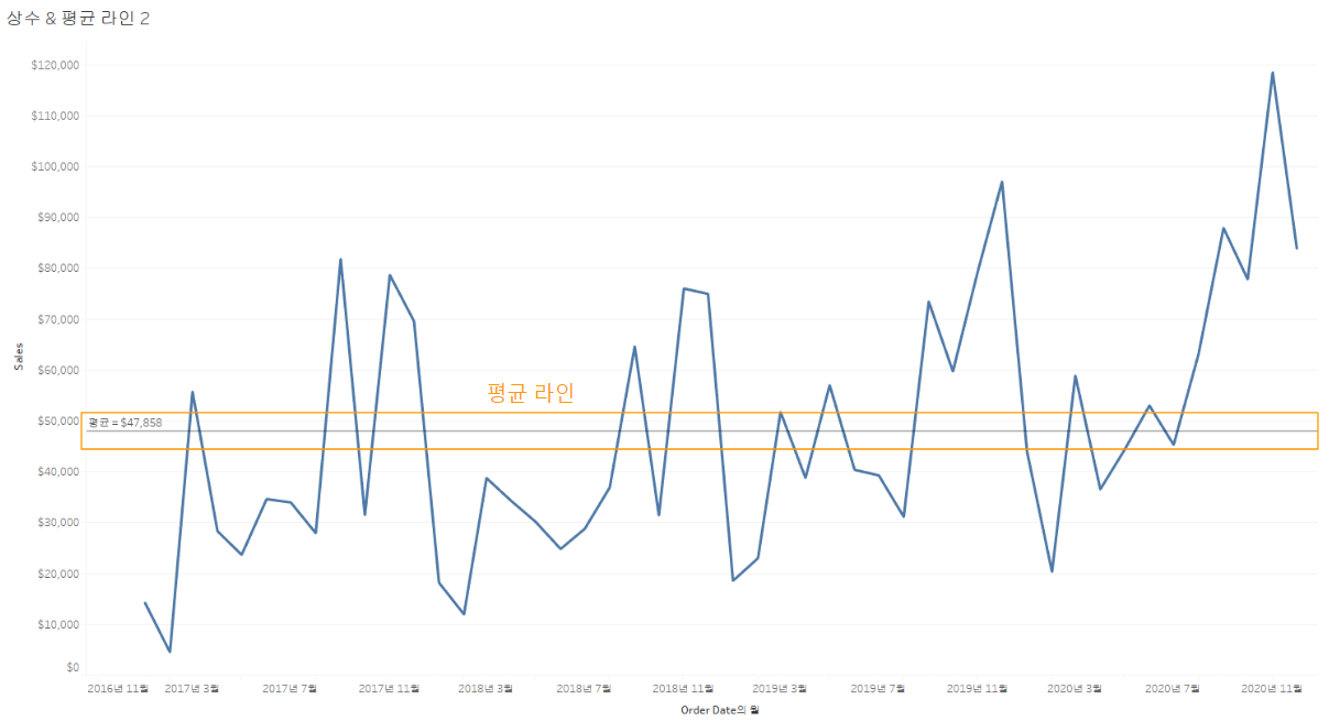 다음으로, 상수 라인을 추가합니다. 이때, Order Date와 Sales 알약이 모두 연속형이므로, 상수 라인은 합계(Sales)와 월(Order Date)에 모두 추가할 수 있습니다.
