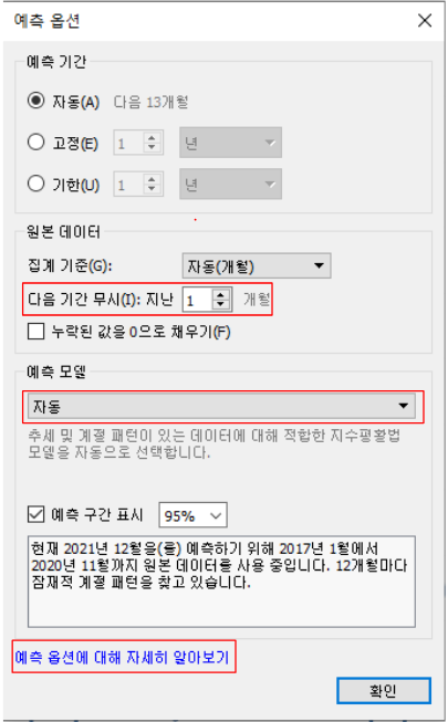- 자동: 예측 모델을 계절적 변동성을 고려한 지수 평활법으로 자동으로 선택합니다.