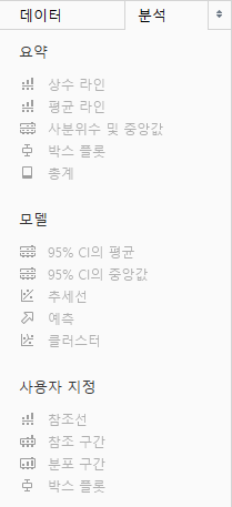 분석 패널은 데이터 시각화 결과를 한 단계 더 정밀하게 분석할 수 있도록 돕는 기능들을 모아놓은 곳입니다. 분석 패널은 작업창 좌측에 데이터 패널 옆에 존재합니다.