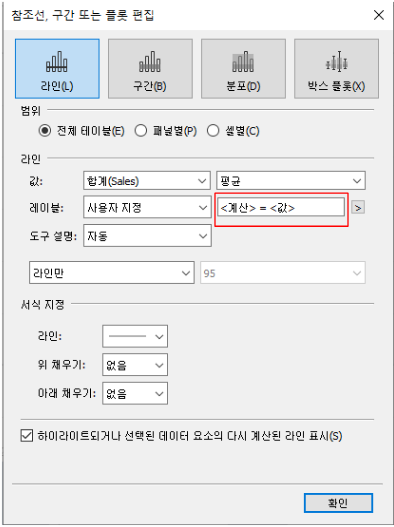 - 평균 라인 우클릭 -> 편집 -> 레이블 -> 사용자 지정 -> '>' 선택 -> 계산 선택 -> '>' 선택 -> 값 선택