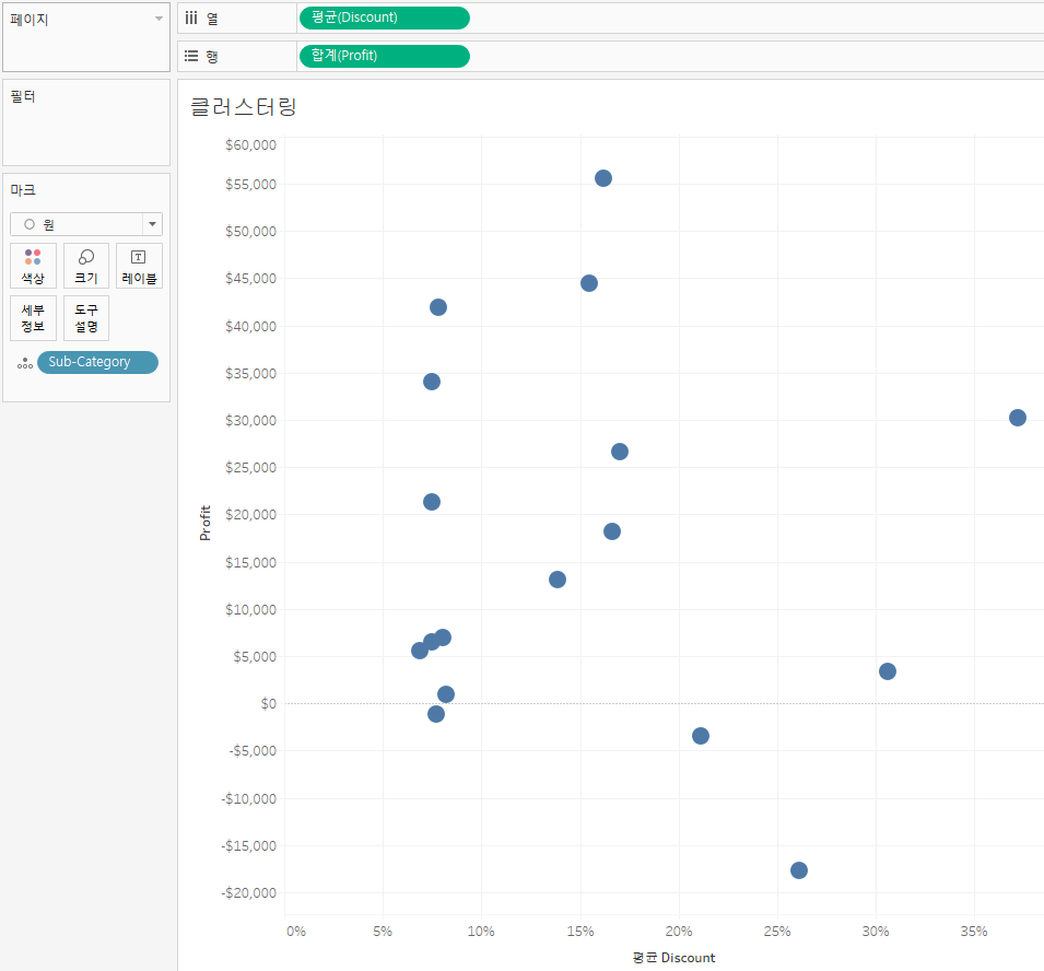 분석 패널의 클러스터링은 데이터를 K-means 클러스터링 알고리즘을 사용하여 분류하는 기능입니다. 클러스터링을 테스트하기 위해 각 Sub-Category 항목 별 평균 할인율과 수익 합계의 상관관계를 시각화합니다. K-means 클러스터링은 비슷한 값을 가진 데이터를 K개 군집(그룹)으로 분류하는 하는 알고리즘입니다. 자세한 내용은 이곳에서 확인할 수 있습니다.