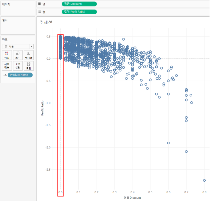 분석 패널의 추세선은 두 개 필드의 상관관계 분포가 어떤 추세를 따르고 있는지 정보를 제공합니다. 추세선을 테스트하기 위해 각 Product Name의 평균 Discount와 Profit Ratio의 스캐터 플롯을 시각화합니다.