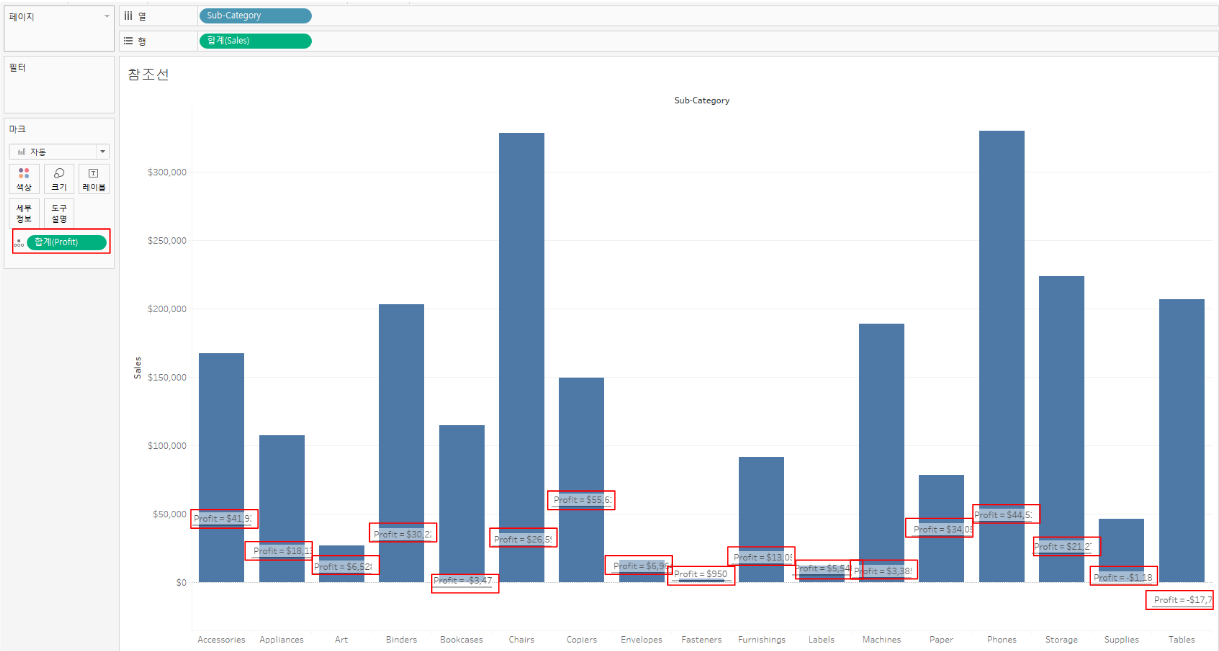 분석 패널의 참조선으로 각 Sub-Category 항목별 Profit 측정값을 표기한다고 한다면, Profit 측정값 필드를 마크 카드 세부 정보에 올려야 합니다.
