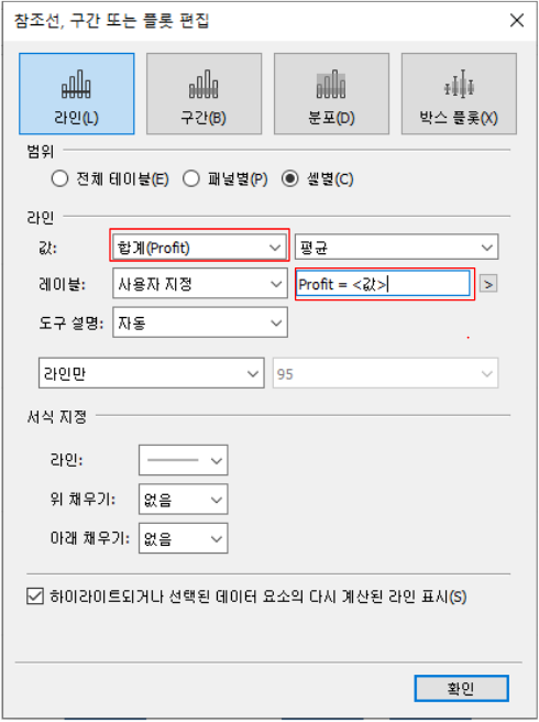 - 값: 참조선을 표현할 대상인 합계(Profit)로 변경