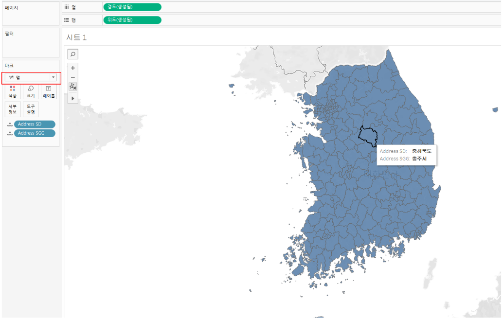 - Address Region 필드가 Address SD - SGG 계층의 최상위 필드가 되며, 이를 마크 카드 세부정보에 올린 후 drill down을 통해 기초 지자체 행정구역까지 시각화할 수 있습니다.