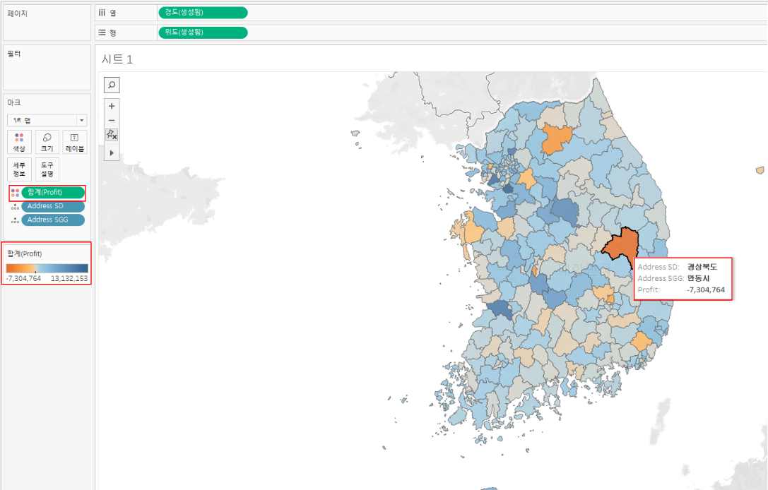 - 경상북도 안동시의 Profit 합계가 가장 저조함을 알 수 있습니다.