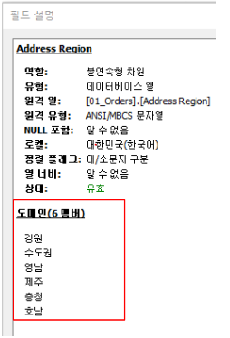 또한, Address Region 필드 정보를 확인하면, 아래와 같이 6개의 멤버가 존재하는 것을 확인할 수 있습니다. 이는 광역 지자체(특별시, 광역시) 보다 상위 행정구역임을 알 수 있습니다. 즉, Address Region 필드도 Address SD - SGG 계층 구조로 적용할 수 있습니다!
