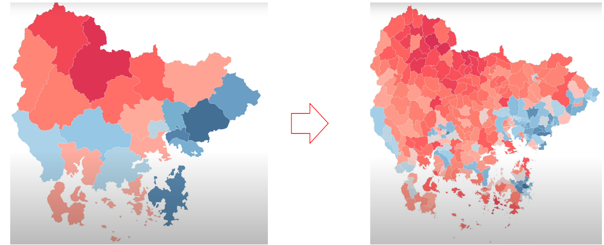 - (ex) 행정구역 '시'별로 분기한 데이터 분포(좌측 이미지)를 '구/군'별로 분기(우측 이미지)하면, 적색과 파란색의 비율에 차이가 달라질 수 있습니다.