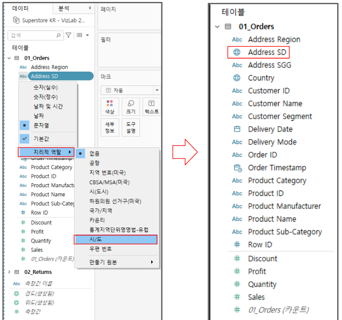 Tableau에서 지도 화면에 시/도, 시/군/구를 표현하기 위해서는 지리적 타입의 행정구역 명칭 데이터가 필요합니다. 우리가 사용하는 Superstore KR - VizLab 2021 데이터셋은 광역 지자체명(도, 특별시, 광역시) 및 기초 지자체명(시, 군, 구) 필드를 포함하고 있습니다.