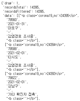 최초 1페이지 서울 확진자 현황 데이터를 예시로 .json 형태로 확인해보면, draw, recordsTotal, data 등을 key로 가지고 있음을 확인할 수 있습니다.
